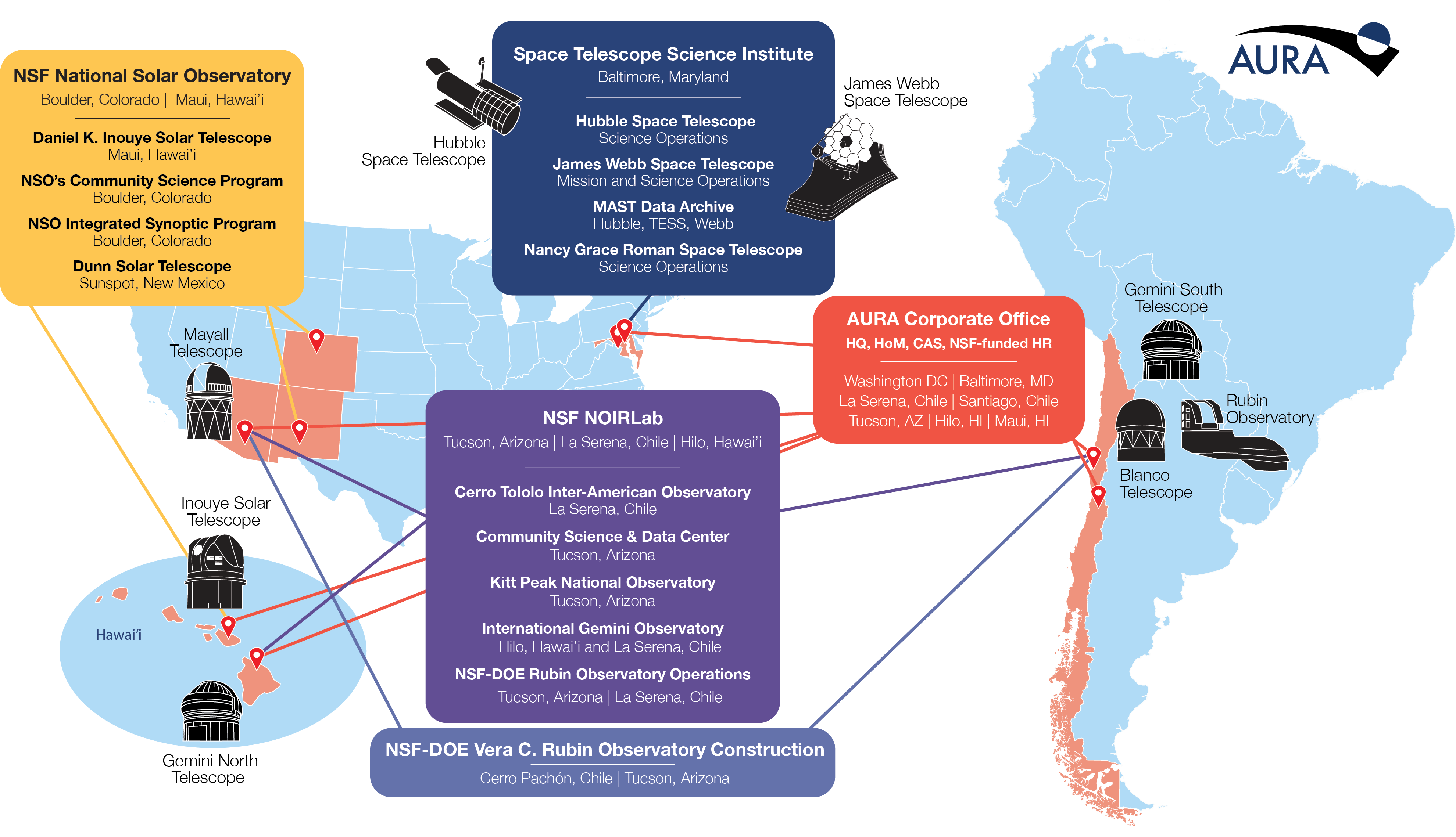 For NSF, AURA manages NOIRLab, located in Tucson Arizona, La Serena, Chile and Hilo, Hawai’i, and the National Solar Observatory (NSO) located in Boulder Colorado and Maui, Hawai’i.